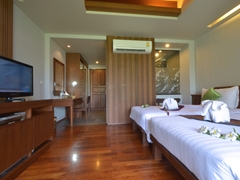 Superior Twin Room Photo Relaxation with superior rooms 45 square meters and touch of all-nature simple and minimalist furnishings. All 12 superior room with sea view, large balcony and set either in tropical gardens comes fully exquisitely furnished with wooden furniture, wood floor and earth warm-tone